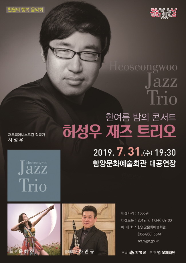 함양군은 오는 31일 오후 7시 30분 문화예술회관 대공연장에서 7월 천원의 행복음악회로 한여름 밤의 콘서트 ‘허성우 재즈 트리오’공연을 연다.