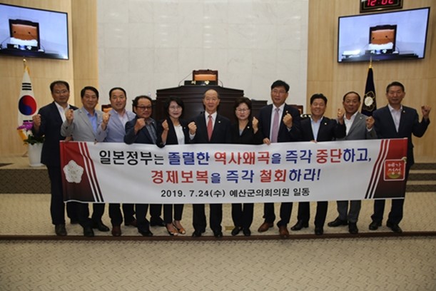 예산군의회는 제251회 임시회 제2차 본회의에서 ‘일본 역사왜곡·경제보복 시정 촉구 결의안’과 ‘서해선과 신안산선 간 환승계획 철회 촉구 결의안’을 만장일치로 채택했다.