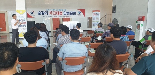 영덕소방서, 한국승강기안전공단 경북동부지사, 유지관리업체 등 유관기관 관계자와 지역주민 등 100여명은 안전교육을 받고 시범훈련에 참여했다.