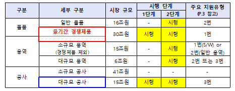 중기부는 1단계로 2019년 말까지 상생협력법 시행령 및 관련 고시 등을 제·개정해 중소기업자간 경쟁제품 시장 및 대규모 공사 등에서 우선적으로 제도를 시행할 예정이며, 향후 ‘중소기업제품 구매 촉진 및 판로지원에 관한 법률’을 개정해 법적 근거를 마련한 후 제도 적용범위를 전체 조달시장으로 확대할 예정이다.