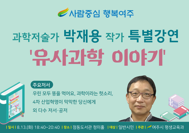 [경기=로컬라이프] 진용두 기자 =과학저술가 박재용 작가가 오는 8월 13일, 오후 6시 40분, 여주 점동도서관에서‘유사과학 이야기’라는 주제로 인문학 특강을 펼친다.