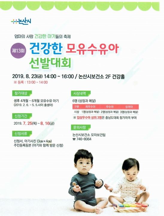 건강한 모유수유아선발대회는 모유수유의 우수성을 홍보하고, 모유수유 확대 분위기를 조성하기 위한 취지로, 오는 8월 23일 논산시보건소에서 개최된다.