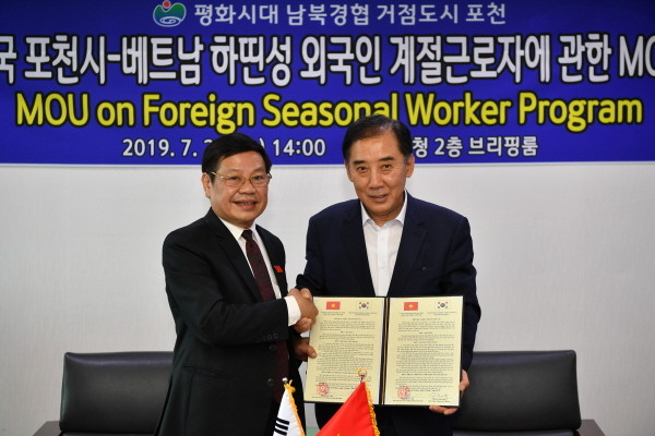 [경기=로컬라이프] 한석훈 기자 = 포천시는 지난 24일 시청 브리핑룸에서 베트남 하띤성과 외국인 계절근로자에 관한 업무협약(MOU)을 체결했다.