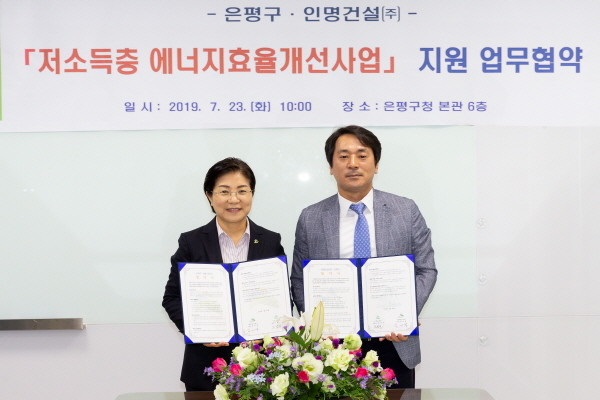 은평구는 저소득층 ‘에너지효율개선사업’의 원활한 추진을 위해 지난 23일 은평구청 본관 6층에서 인명건설과 협약식을 개최했다.