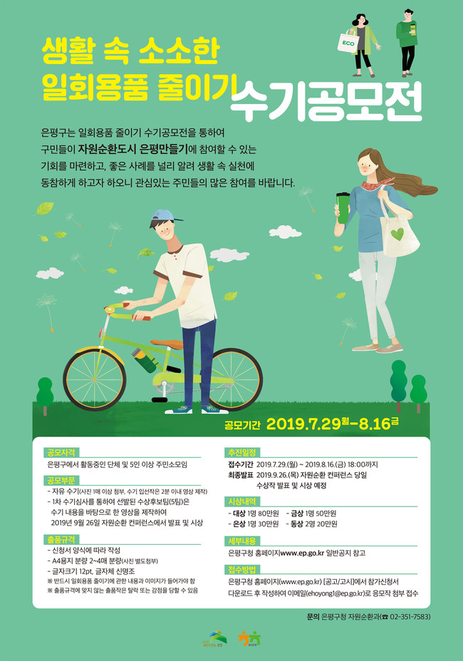 서울 은평구는 오는 29일부터 8월 16일까지 구민들이 ‘자원순환도시 은평만들기’에 참여할 수 있는 기회를 마련하고, 일상 생활속에서 일회용품 줄이기 사례를 널리 알려 생활 속 실천에 동참하기 위한 ‘생활 속 소소한 일회용품 줄이기 수기공모전’을 개최한다.