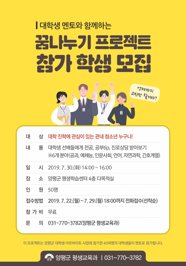 ‘꿈나누기 프로젝트’는 양평군 대학생 아르바이트 사업의 일환으로 올해 처음 시행하는 것으로 아르바이트 참가 대학생이 ‘멘토’, 청소년들이 ‘멘티’가 되어 진행하는 멘토링 프로그램이다.