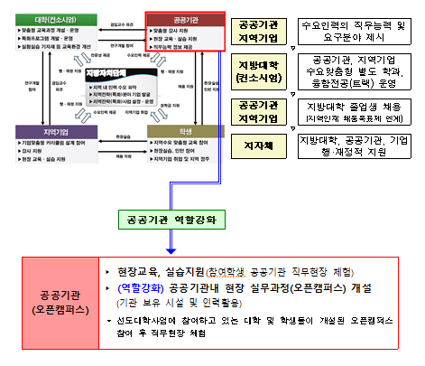 지난해 시범사업으로 추진되었던 선도대학육성사업에서 이전 공공기관의 사업 참여가 강사지원과 기관 현장체험 위주였다면, 올해는 학생들이 기관 현장체험 이전에 공공기관이 지역교육과정을 개설하고 이에 학생들이 참여할 수 있도록 공공기관의 역할을 강화할 계획이다.