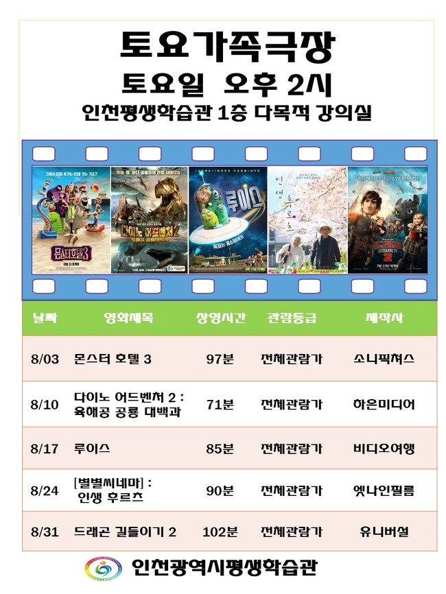 인천평생학습관에서는 무더운 여름철을 맞이하여 가족 애니메이션 4편과, 별별씨네마 1편을 매주 토요일 오후 2시 다목적강의실에서 상영한다.