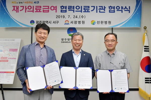 광주 서구가 지난 24일‘재가 의료급여 시범사업’추진을 위한 협력의료기관으로 서광병원과 선한병원을 선정하고 협약식을 가졌다.