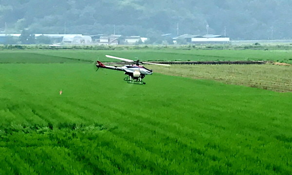 25일, 영산면 신제2구 들판에서 무인헬기로 항공방제를 하고 있다.