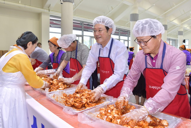 양파김치 나눔행사에는 이용섭 시장을 비롯해 세계김치연구소, 농협중앙회, 광주축협, 매일유업, 호남청과 등 지역 기업과 공공기관 임직원, 소비자단체 관계자 등 120여 명이 참가해 광주세계김치축제 대통령상 수상자 곽은주 씨의 지도로 진행됐다.