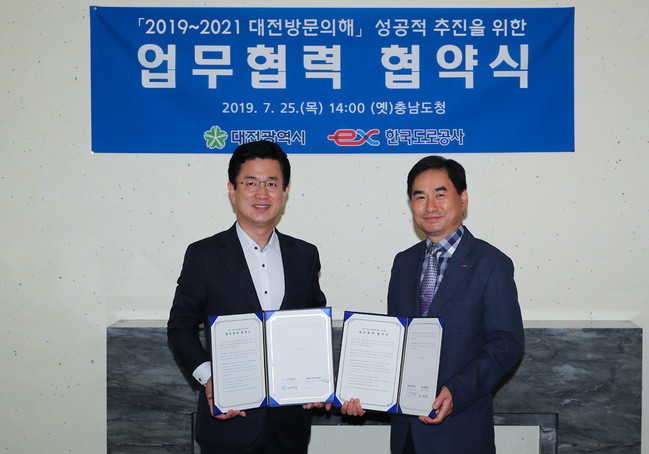대전시는 25일 오후 2시 옛 충남도청 응접실에서 한국도로공사 대전충남지사와 ‘2019~ 2021 대전방문의해’ 성공 추진을 위한 업무협력 협약을 체결했다.