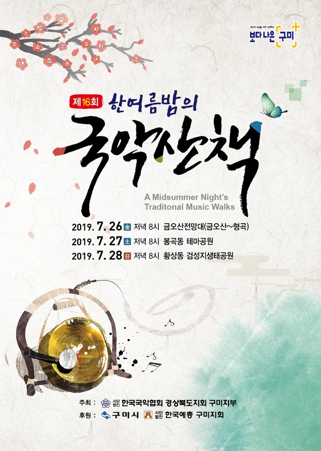 구미시는 오는 26일부터 28까지 3일간 (사)한국국악협회 구미지부(회장 류제신) 주최로 제16회 한여름밤의 국악산책을 개최한다.