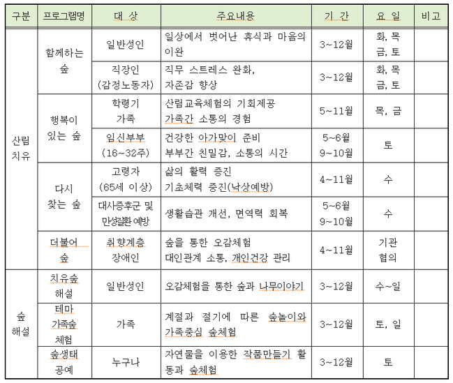 프로그램 운영을 위한 시설로는 숲속치유마당, 풍욕장, 숲속명상터, 솔바람 쉼터, 마음 나눔터 등이 있으며 주요 프로그램은 초·중학생을 동반한 가족을 대상으로 하는 행복한 숲, 성인을 대상으로 하는 쉼이 있는 숲, 청소년을 대상으로 하는 내 마음의 숲, 어르신들을 대상으로 하는 다시 찾는 숲, 임신부부를 대상으로 하는 태교숲 등의 프로그램이 있으며 프로그램은 동절기를 제외하고 매일 2회 운영되며 체험시간은 2시간정도 소요된다.
