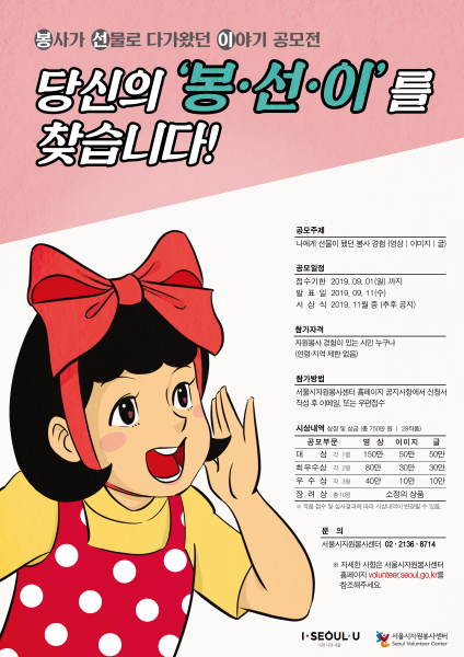 서울시자원봉사센터가 자원봉사를 통해 얻을 수 있는 다양한 경험과 가치를 홍보하기 위해, 오는 9월 1일까지 38일간 봉사가 선물로 다가왔던 이야기 ‘봉.선.이’ 공모전을 개최한다.