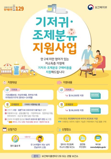 지원 금액은 월별 기저귀 구입비 6만 4천원이다. 여기에 암, HIV감염 등 수유가 불가능한 사례로 인정되면 조제분유 구입비 월 8만 6천원이 추가 지원된다.