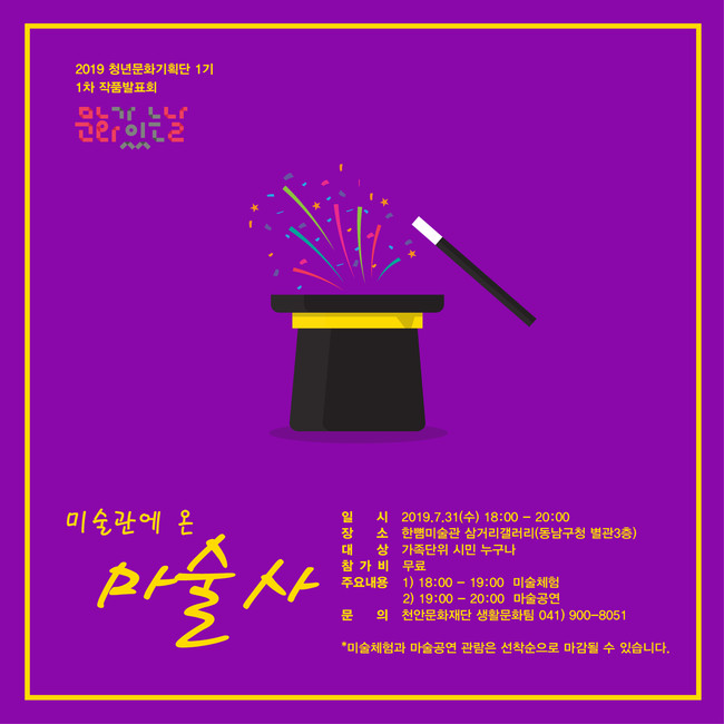 미술체험과 마술공연 관람은 무료이고 선착순으로 마감될 수 있으며, 작품발표회에 관한 자세한 사항은 천안문화재단 생활문화팀로 문의하면 안내받을 수 있다.