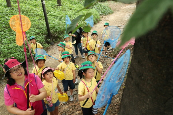 성동구 송정제방에서 아이들이 매미학습교실에 참여하고 있다.