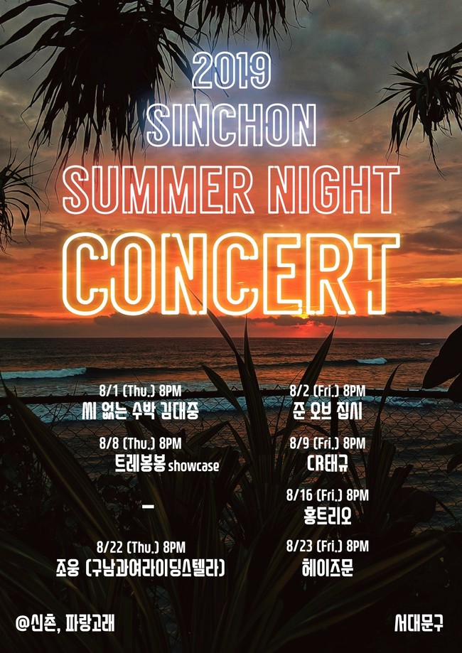 서대문구가 8월 창천문화공원에 위치한 ‘신촌, 파랑고래’ 앞 ‘고래마당’에서 총 7회에 걸쳐 인디뮤지션들이 참여하는 열대야 콘서트 ‘2019 SINCHON SUMMER NIGHT CONCERT’를 개최한다고 26일 밝혔다.