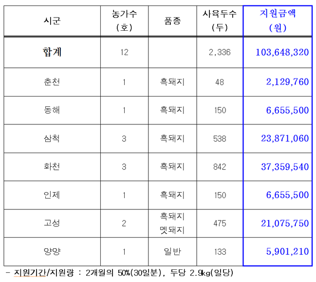 사료 지원은 7개 시군에서 12농가가 103백만 원을 신청했다. 축사 시설현대화 사업은 수요를 조사 중에 있으며, 사료구매자금은 농림축산 식품사업 시행 지침이 개정되는 대로 수요를 조사하여 대출을 실행할 계획이다.