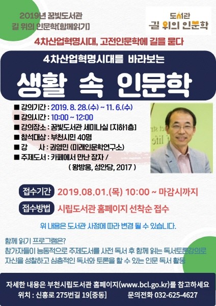 [경기=로컬라이프] 김보경 기자 = 부천시립꿈빛도서관은 ‘2019년 도서관 길 위의 인문학’함께 읽기 두 번째 강좌로 ‘4차 산업혁명시대를 바라보는 생활 속 인문학’프로그램을 오는 8월 28일부터 11월 6일까지 매주 수요일 오전 10시에 운영한다.