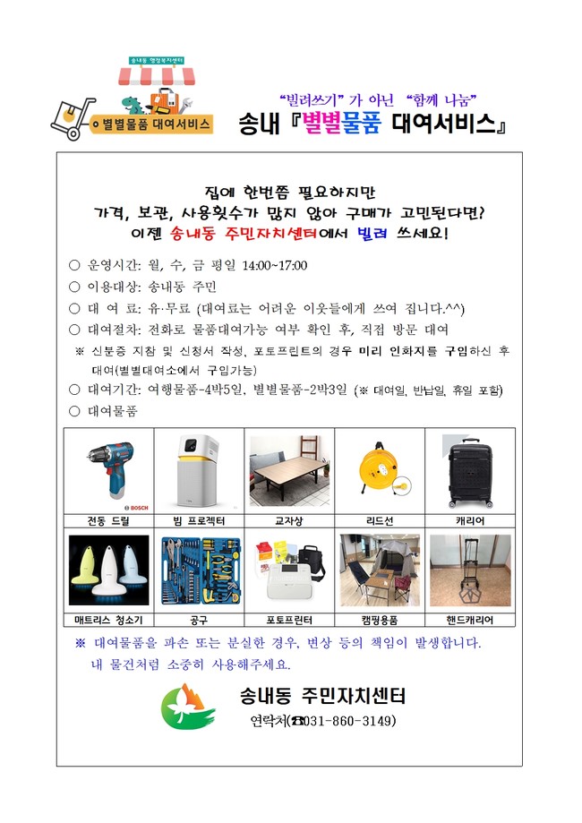 ‘별별물품 대여서비스’는 지역주민이 각 가정에서 보관, 가격, 사용 횟수 등의 사유로 구입하기 부담되는 물품을 합리적인 가격으로 대여하여 생활의 경제성 제고 및 공유문화를 확산시키고, 대여 수입금을 지역 사회에 환원하여, 주민이 가족과 함께 참여하고 나누는 마을을 만들고자 사업을 시작하게 됐다.
