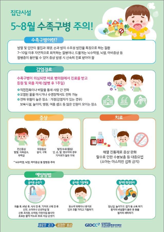 수족구병은 예방백신이 없고 한번 앓았더라도 재감염이 될 수 있어 5세 이하 영유아를 둔 가정과 집단시설은 개인위생 등 주의가 필요하다. 바이러스성 접촉성 감염병으로 발열, 두통을 동반한 설사와 구토, 발진 등이 나타나는 것이 특징이다.