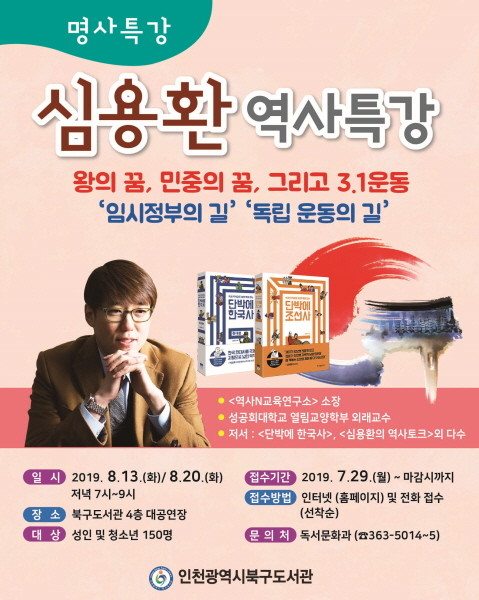 인천북구도서관에서는 오는 8월 13일과 20일 오후 7시부터 9시까지 인기 역사 강사 ‘심용환’과 함께, 독립 운동을 주제로 역사 특강을 개최한다.