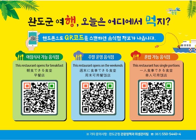 완도군은 지역을 찾는 관광객들에게 음식점 정보를 편하게 알려줄 수 있는 음식점 QR코드 포스터를 제작하여 관광지 및 다중이용시설에 부착했다.