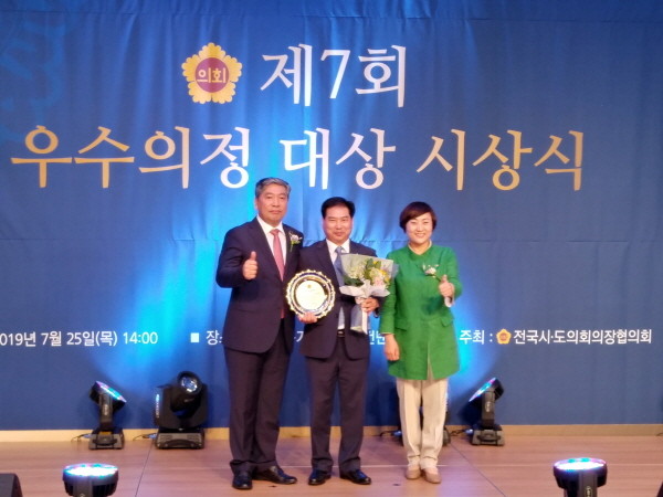 ‘우수의정대상’은 전국 시·도의회의장협의회가 주관하며, 지난 1년 동안 탁월한 의정활동을 통해 지역주민의 삶의 질 향상과 지역발전에 기여한 공이 큰 전국 광역의회 의원에게 수여하는 상이다.