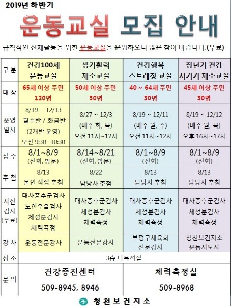 부평구 청천보건지소는 지역 주민들의 건강 증진을 위해 2019년 하반기 신체활동프로그램을 오는 8월부터 무료로 운영한다.