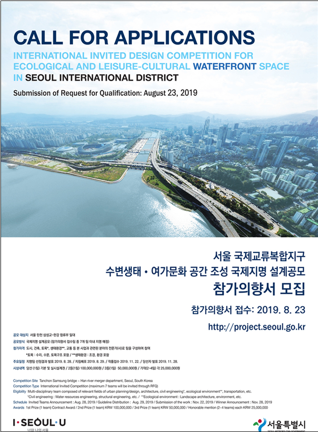 김선순 서울시 지역발전본부장은 “이번 설계공모를 통해 현재 콘크리트로 덮여있는 탄천변과 한강변의 자연성을 회복하고, 다양한 수변 시설과 프로그램을 갖추길 기대한다”며 “국제 MICE 관광객과 시민 모두가 즐길 수 있는 수준 높은 수변문화 여가공간이 조성될 수 있도록 설계공모 참가의향서 모집에 전문가들의 많은 참여를 바란다”고 말했다.