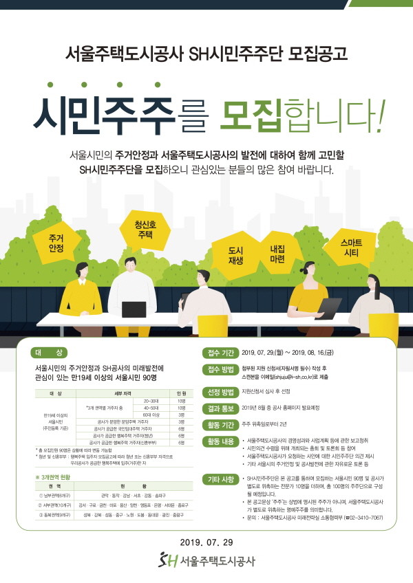 서울주택도시공사가 시민주주기업으로 거듭나기 위해 서울시민을 대표하는 ‘SH시민주주단’100명을 모집한다.