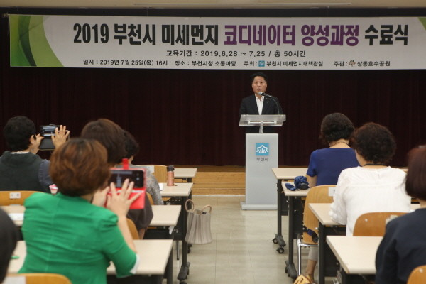 장덕천 부천시장은 수료생들에게 축하 인사를 하며 “지난 해 10월 미세먼지 문제 대응 전담 기관인 미세먼지대책담당관 신설을 시작으로, 지난 7월 19일 한국 입자에어로졸학회와 협약을 통한 미세먼지 공동추진 자문단 구성, 그리고 오늘 미세먼지 코디네이터 수료까지 미세먼지 정책을 수행할 ‘행정-전문가-시민’이라는 퍼즐이 완성됐다”라고 말했다.