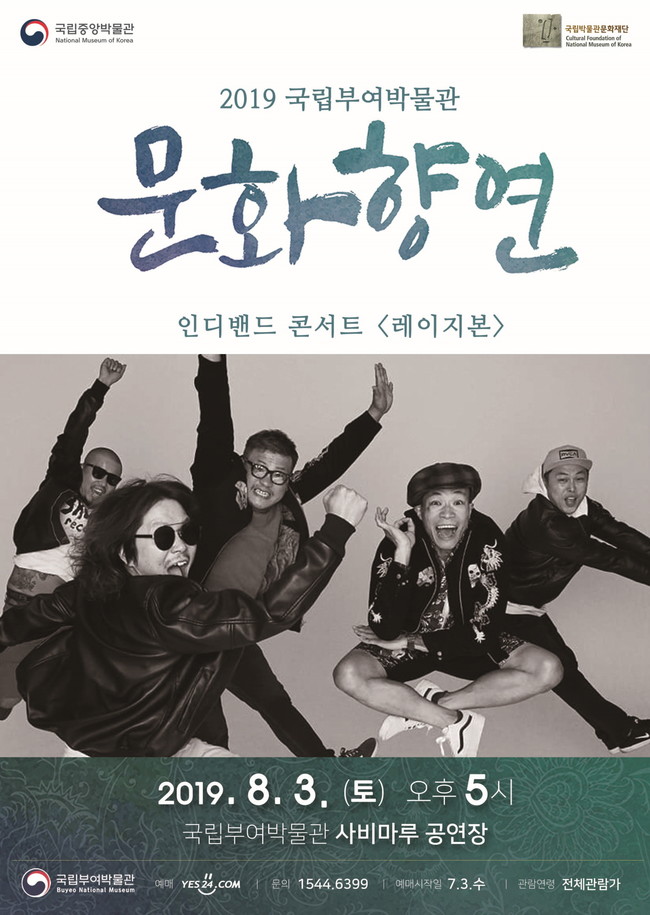 8월 3일 5시에는 한국 인디밴드 1세대를 대표하는 ‘레이지본’ 콘서트가 사비마루 무대에 오른다. 국립박물관 문화향연으로 진행되는 이번 공연은 ‘마법의 성’ 등 누구나 아는 다양한 노래들로 신나는 콘서트를 선보일 예정이다. 대체 불가능한 에너지와 방송과 페스티벌을 넘나들며 쌓은 라이브 실력으로 더위를 날려주는 신나고 유쾌한 시간이 될 것이다.