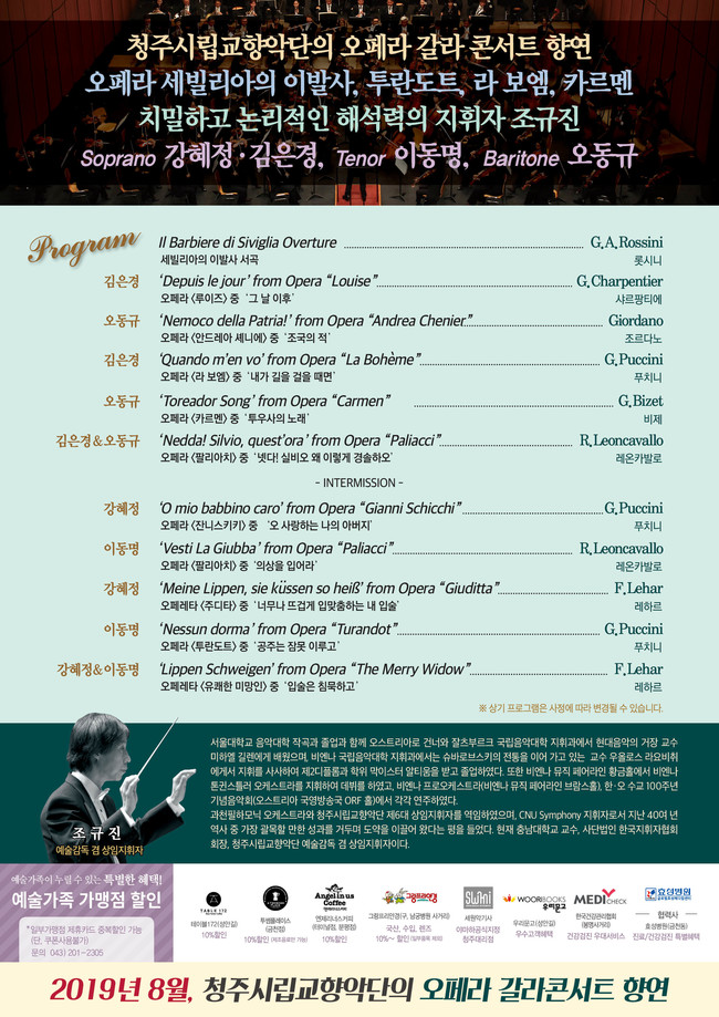 롯시니 오페라 ‘세빌리아의 이발사’ 서곡을 시작으로 소프라노 김은경이 샤르팡티에 오페라 ‘루이즈’ 중‘그 날 이후’를 바리톤 오동규가 조르다노 오페라 ‘안드레아 셰니에’ 중‘조국의 적’, 소프라노 김은경 바리톤 오동규 듀엣으로 레온카발로 오페라 ‘팔리아치’ 중‘넷다 실비오 왜 이렇게 경솔하오’를 노래한다. 또한 소프라노 강혜정이 푸치니 오페라 ‘잔니스키키’ 중‘오 사랑하는 나의 아버지’, 테너 이동명이 레온카발로 오페라 ‘팔리아치’ 중‘의상을 입어라’를 열정적인 무대를 선사한다. 마지막으로 소프라노 강혜정 테너 이동명 듀엣으로 레하르 오페레타 ‘유쾌한 미망인’ 중‘입술은 침묵하고’를 청주시립교향악단과 감성적인 콜라보레이션으로 대미를 장식한다.