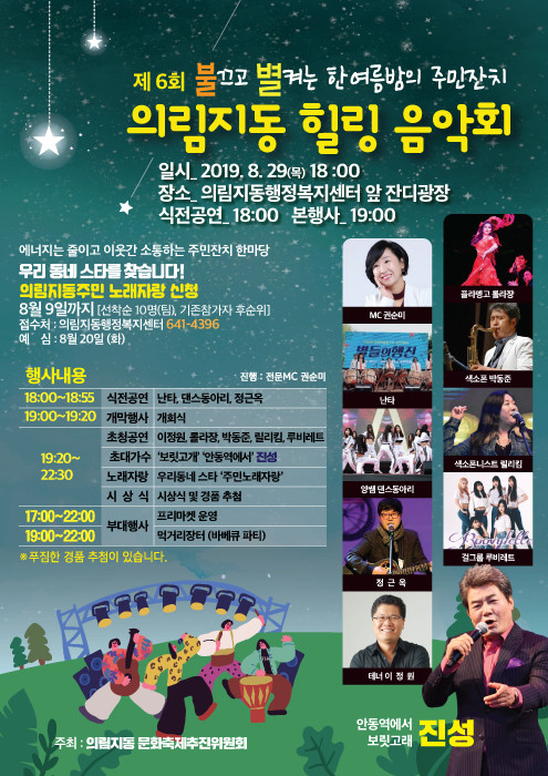 의림지동 행정복지센터는 이달 29일부터 내달 9일까지 2주간 “제6회 의림지동 힐링음악회” 노래자랑 참가자를 모집한다고 밝혔다.