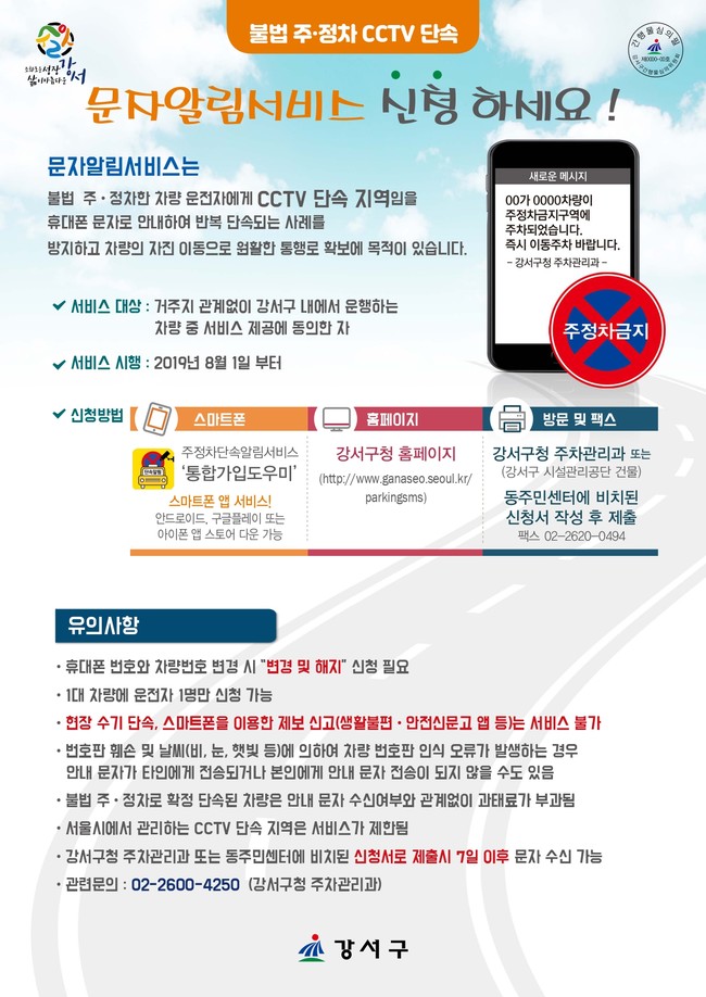서울 강서구가 오는 8월부터 CCTV 주차단속 문자알림 서비스를 시작한다.