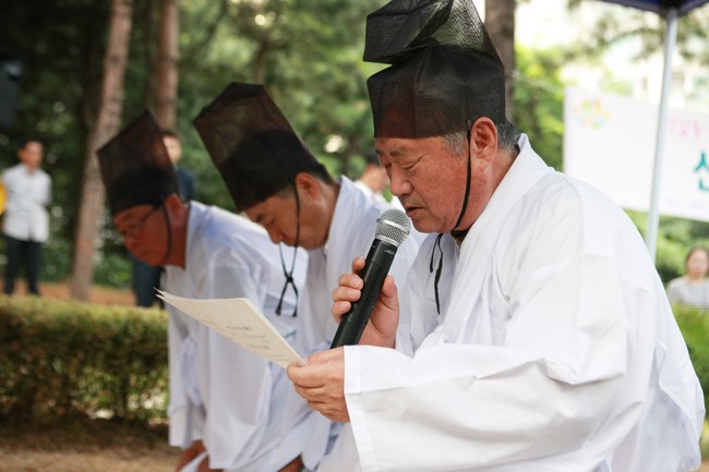 지난해 8월 열린 강일동 산치성제에서 제관들이 제례를 드리고 있다.