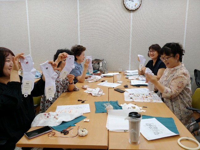 자수 클래스 반에서는 제5회 신둔평생학습축제시 양말 자수 체험프로그램에서 남은 재료를 가지고 회원들이 한땀 한땀 장미자수를 놓아 양말 20켤레를 완성하여 주민센터에 기부했다.