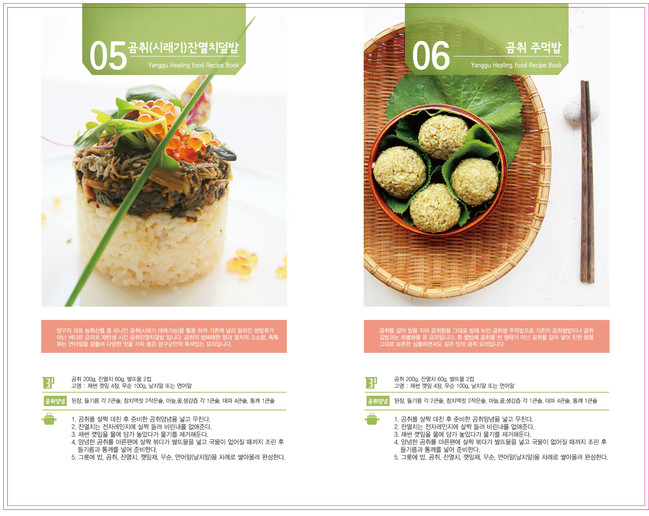 지난 2월부터 시작된 국토정중앙 힐링푸드 개발 용역은 먼저 양구군의 농·특산물 현황을 파악한 후 양구 산 농·특산물의 활용도 및 보급화 가능성이 높은 새 메뉴 개발에 나서 지금까지 5회의 레시피 개발 보고와 2회의 중간보고회를 개최하면서 보완작업을 거듭해왔으며, 최종 보고회에 맞춰 레시피 북을 발간했다.
