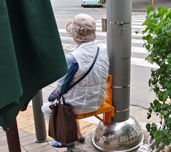 장수 의자는 노인뿐 아니라 보행이 불편한 어린이, 임산부 등 교통 약자에게 잠시라도 쉴 수 있는 편의를 제공하여, 신호대기로 인한 무단횡단을 막고 안전한 보행 환경을 조성하기 위해 설치된 것이다.