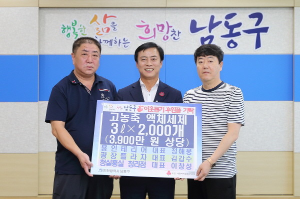 인천 남동구 지역 내 용인테리어, 광장플라자, 청실홍실 청라점은 지난 26일 취약계층 지원을 위한 3천9백만 원 상당의 고농축 액체세제 2,000개를 남동구에 기탁했다.