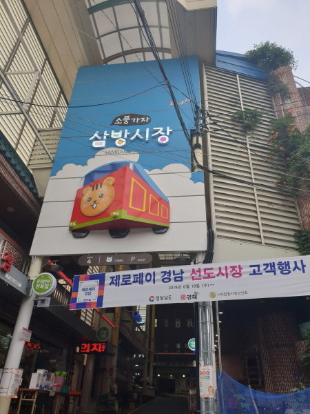 김해 삼방시장이 지난달 19일부터 제로페이 이용 고객에게 선물을 주는 이벤트를 진행 중인 가운데 시장 입구에 이를 알리는 현수막이 걸려 있다.