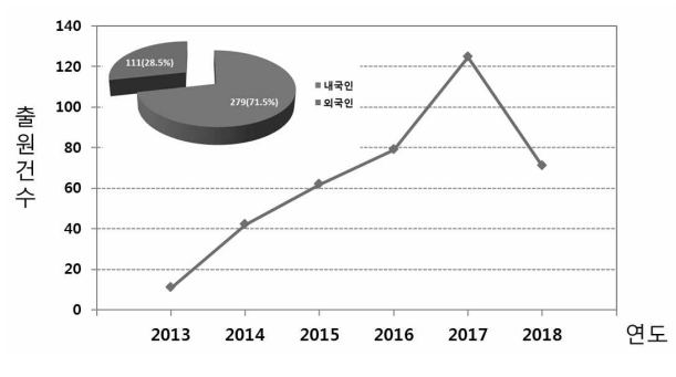 특허청(청장 박원주)에 따르면, 오바마 前 미국 대통령의 연두 국정연설을 계기로 3D프린팅 기술에 대한 관심이 높아지기 시작한 2013년 출원건수가 11건에 불과했으나, 2014년 42건, 2015년 62건, 2016년 79건, 2017년 125건으로 급증했다. 2018년 71건으로 2017년에 비해 성장세가 다소 주춤했지만, 2013년 대비 약 7배 증가한 것으로 나타났다.