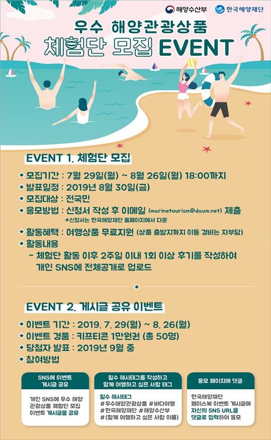 한국해양재단 누리소통망에서는 ‘2019 우수해양관광상품 체험단 모집 공유행사’가 함께 진행된다. 체험단 모집 게시글을 개인 누리소통망에 공유하고 필수 해시태그를 작성한 후 응모 페이지에 댓글을 작성하면 추첨을 통해 50명에게 1만 원 상당의 모바일상품권을 지급한다.