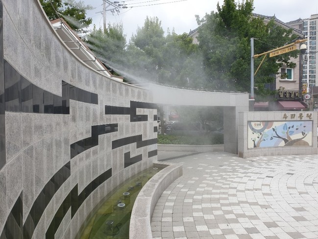 이 시설은 온도 감지센서가 달려 있어 기온이 27도 이상이고 습도가 70% 미만이면 10~20마이크론 이하 미세한 물입자를 안개처럼 분사해 주위 온도를 5도 가량 낮춰준다.