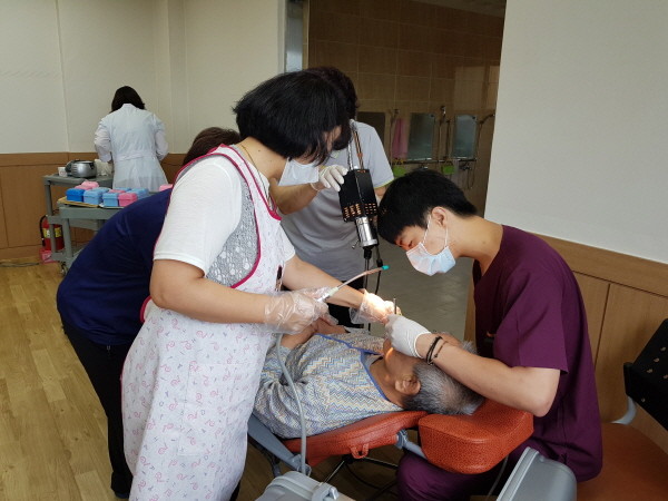 구강보건 전문인력이 이동용 치과 진료장비를 가지고 노인요양원을 직접 방문해 스케일링과 불소겔 도포, 잇솔질 교육, 틀니세척을 진행했다.