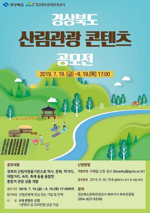 산림관광 콘텐츠 공모전은 도내 우수한 산림관광 자원을 기반으로 체험거리와 먹거리, 숙박 코스를 발굴하는 종합적 관광상품으로 관심 있는 기업이나 단체 누구나 참여할 수 있으며, 오는 9월 19일까지 공모한다.