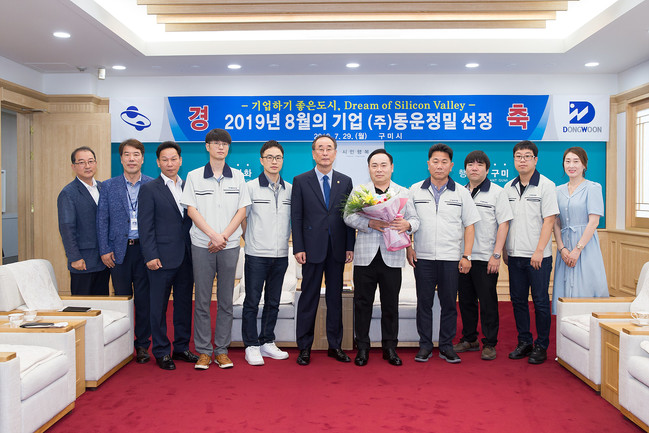 구미시는 오는 8월 이달의 기업으로 정밀 기계 부품 전문기업인 동운정밀을 선정하고 7월 29일 오전 9시 시청게양대에서 회사 임직원 등 40여 명이 참석한 가운데 이달의 기업 회사기 게양식을 가졌다.